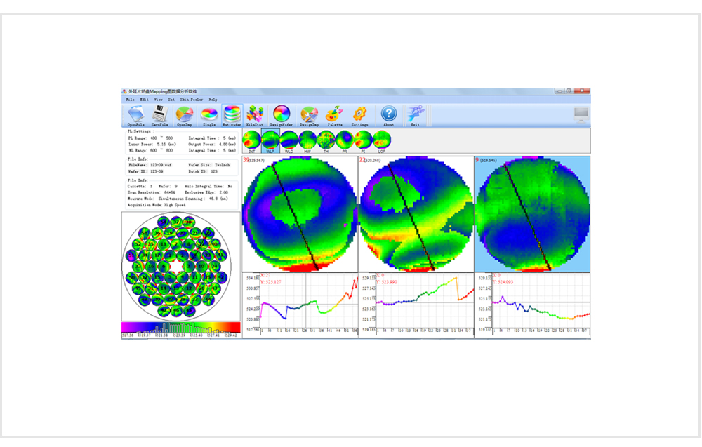 通過特定波長激光激發(fā)指定材料,獲得熒光光譜,對熒光光譜進(jìn)行采集并后處理呈現(xiàn)熒光各項(xiàng)特征。波長覆蓋紫外到近紅外(200-2500nm),可對2-12寸外延片進(jìn)行測量。